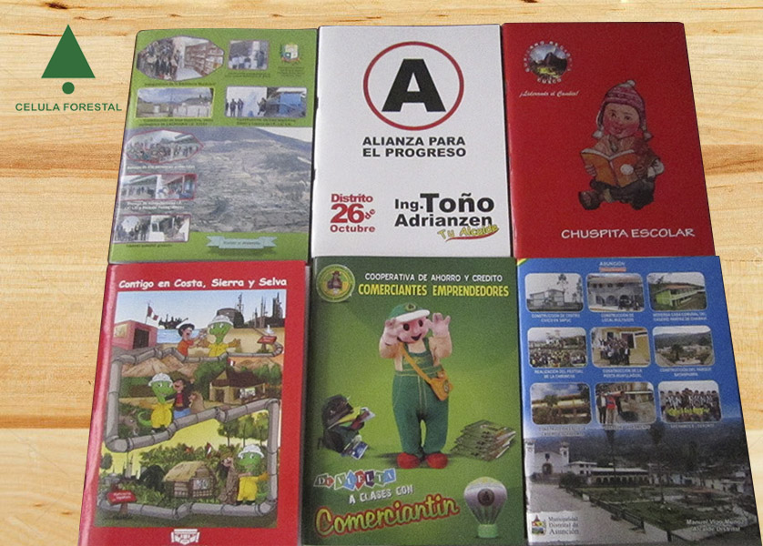 La fábrica de cuadernos Célula Forestal produce cuaderno tamaño A4 de 80/90/96 hojas en papel bond de 56 y 60 gramos, caratula impresa full color tira y retira, acabado plastificado brillo y una hoja de stiker.